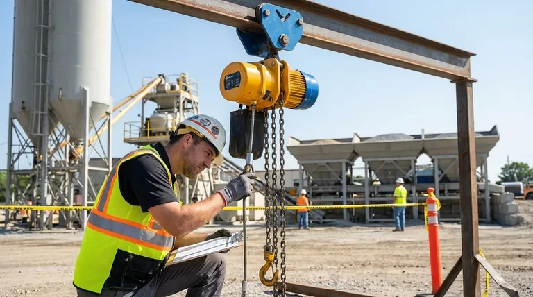 | Механическая целостность | Осмотрите цепь/трос, крюк, точки крепления, основные компоненты и смазку. |
